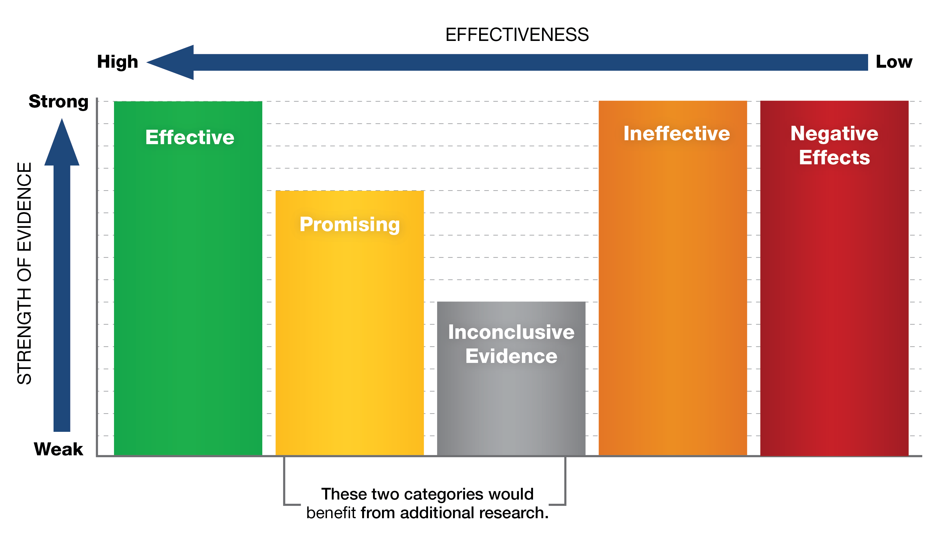 Where a program or practice (referred to collectively as interventions) sits on the Effectiveness axis tells us how well it works in achieving criminal justice, juvenile justice, and victim services outcomes. Where it sits on the Strength of Evidence axis tells us how confident we can be of that determination. Effectiveness is determined by the outcomes of an evaluation in relation to the goals of the intervention. Strength of evidence for programs is determined by the rigor and design of the outcome evaluation, and by the number of evaluations. Strength of evidence for practices is determined by the rigor and design of the studies included in the meta-analysis.
